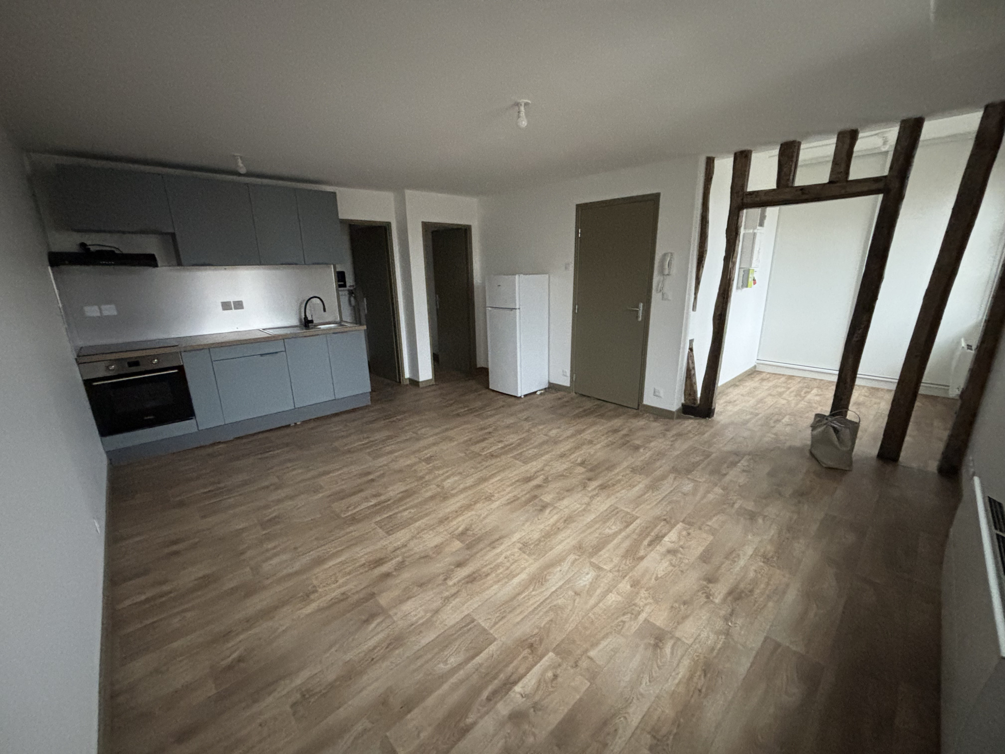 La pièce principale accueille une cuisine aménagée et équipée ouverte , créant un espace de vie lumineux.